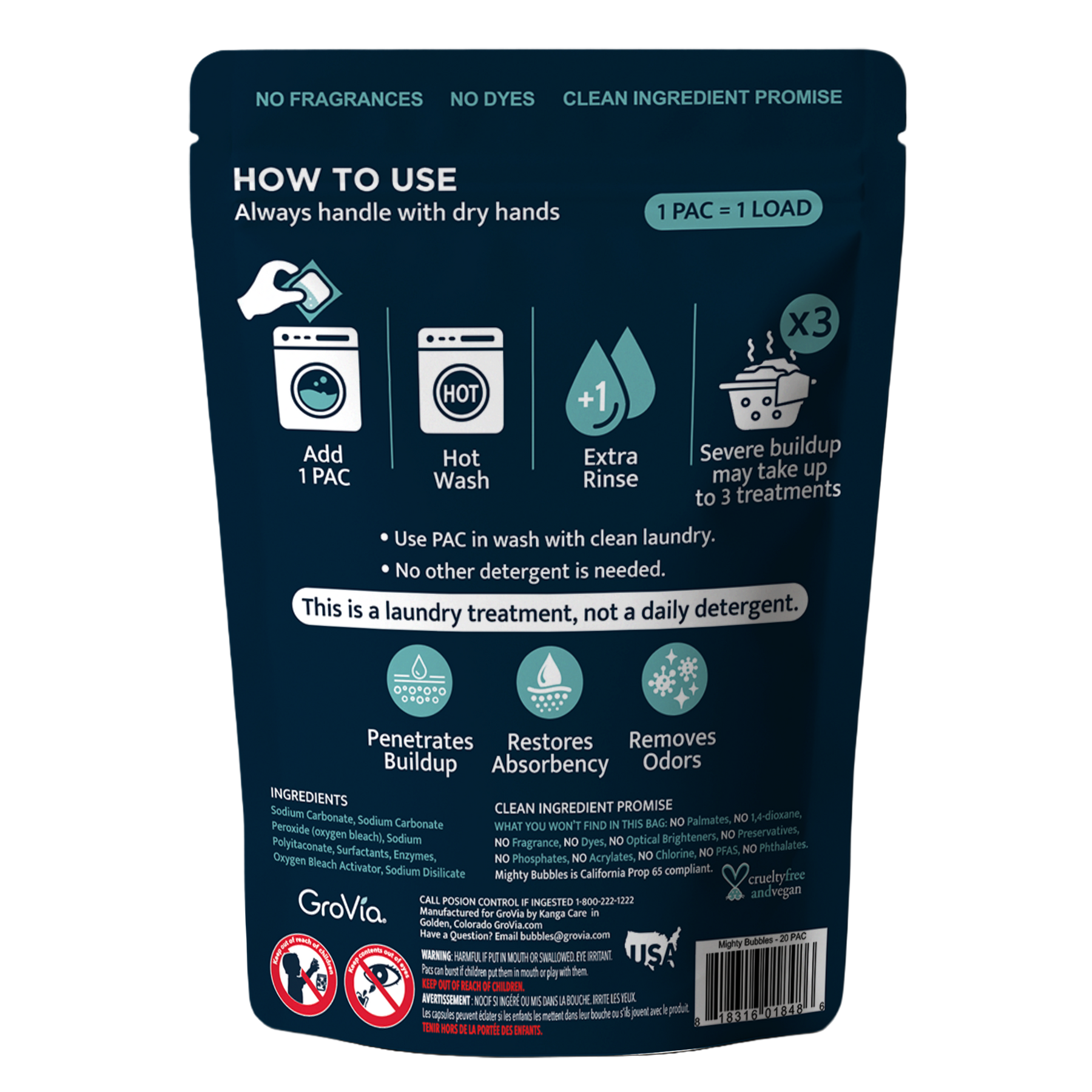 Mighty Bubbles is formulated to penetrate deep into fabric fibers, breaking down residue, grime, and odor-causing buildup without harsh chemicals or damage to your laundry. It is especially loved by cloth diaper users, but works beautifully on towels, athletic wear, linens, and everyday laundry that needs a serious refresh.